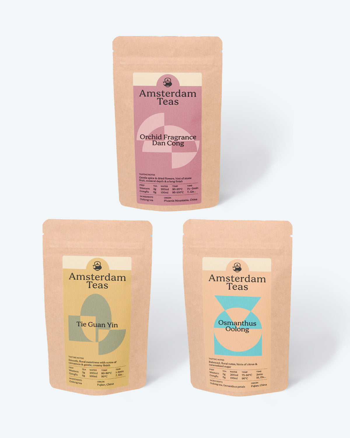 An introduction to our oolong teas with three of our most popular: the rich Orchid Fragrance Dan Cong, floral Osmanthus oolong, and warm Tie Guan Yin, one bag each of 25g (75g total). These three oolongs demonstrate the variety of remarkable flavors to be found in oolong teas.