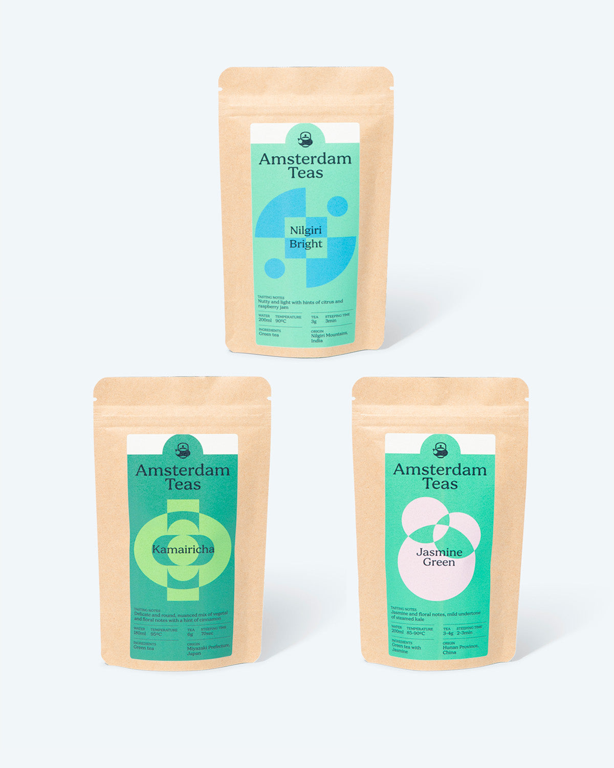 Een kennismaking met onze groene thee met drie uitstekende voorbeelden uit de hele wereld: Nilgiri Bright (uit India), Jasmijn Groen (uit China), en Kamairicha (uit Japan), elk een zakje van 25g (75g totaal). Deze drie tonen de bruisende smaken van groentethee.