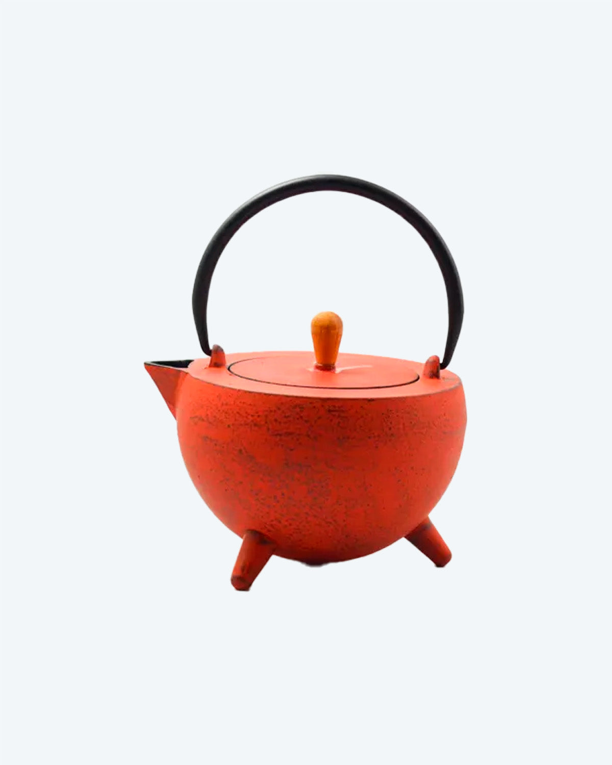 Rood; gietijzeren theepot met houten knop, geëmailleerde binnenkant en roestvrijstalen zeefje