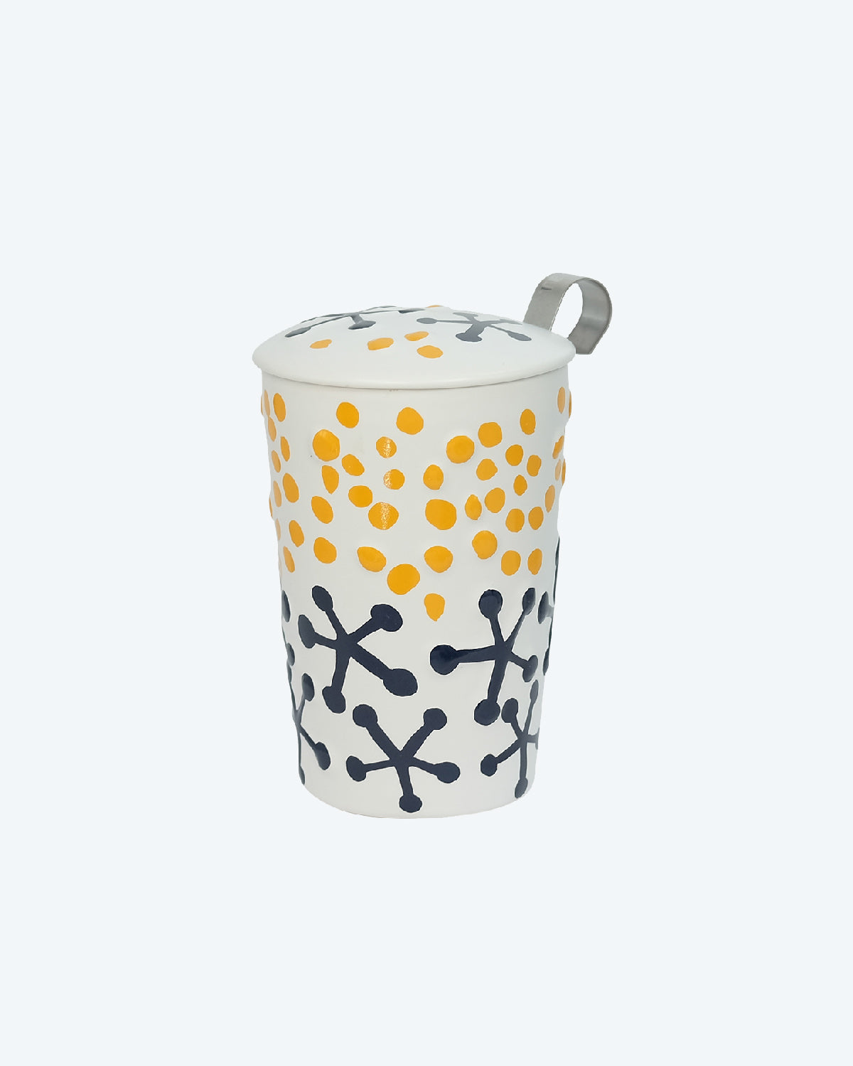 Multi-color print on white, double-walled porcelaine with stainless steel strainer.