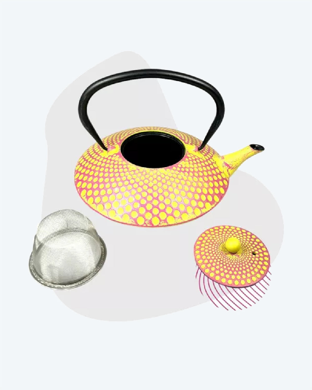 Yellow dots on purple base in cast-iron with enamelled interior and stainless steel strainer.